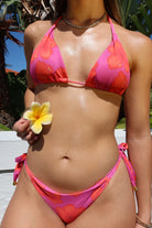 Featuring a stunning pink and red floral print, this set is designed to make a statement. The adjustable triangle top and ruched tie-side bottoms offer the perfect fit, ensuring both comfort and confidence. Finished with elegant gold hardware, this bikini embodies tropical luxury with a touch of Brazilian flair.