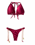 Bold color meets beachy flair. The Mamacita Set is your ultimate hot-girl summer staple — with a classic triangle top, colorful braided side-tie bottoms, and a cheeky back that brings the heat. Designed in a spicy red shimmer fabric and paired with playful multicolor ties, this set is made to stand out under the sun.