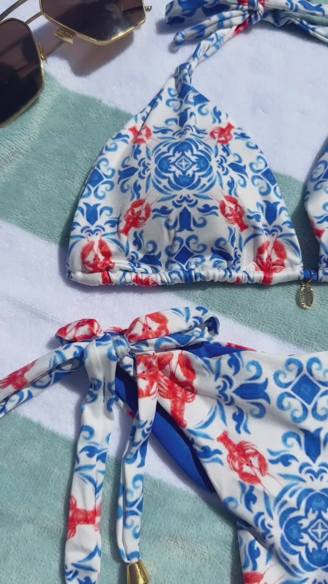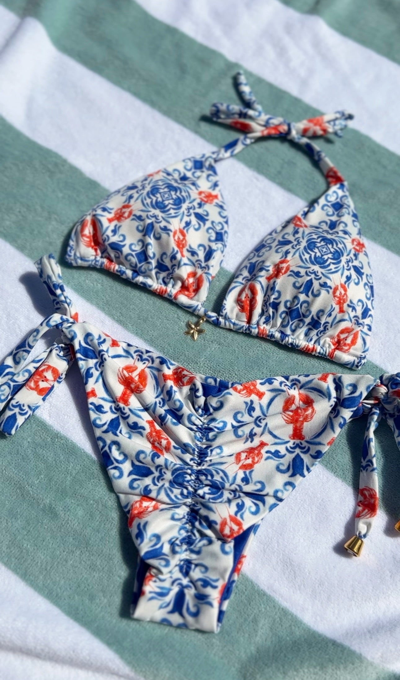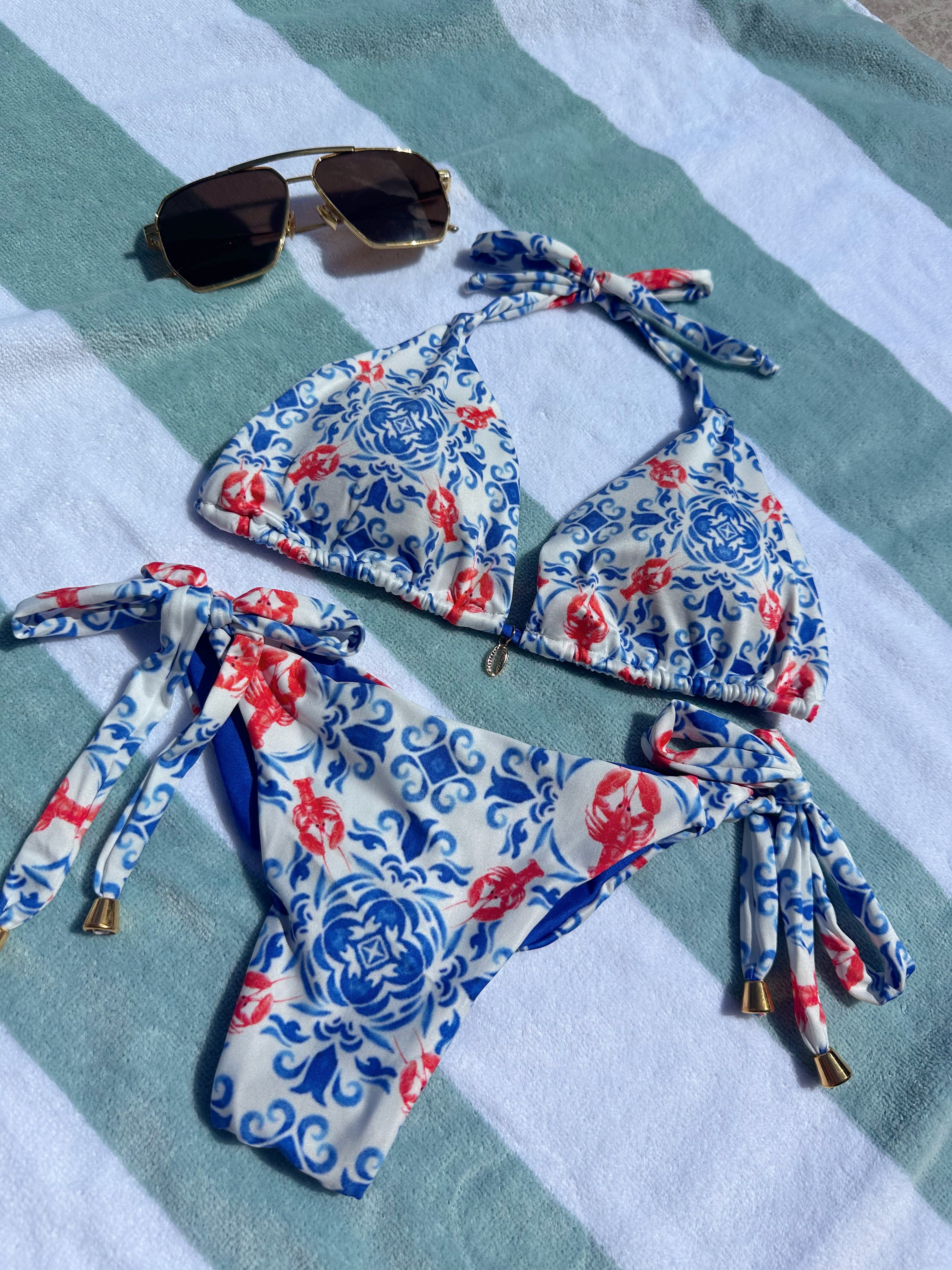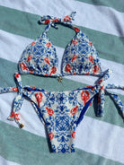 A playful nod to coastal tiles and summertime cravings, the Azulejo Set is your go-to for that effortlessly chic, sun-kissed look. Featuring a red and blue lobster tile print, this bikini brings flirty Mediterranean vibes with a luxe twist.